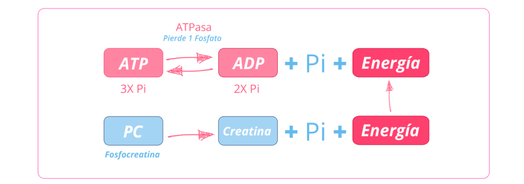 En este metabolismo el ATP, molécula necesaria para la contracción muscular de las fibras blancas o rápidas, se consigue de inmediato sin pasar por procesos intermedios ya que se sintetiza al instante a partir de los fosfatos que se encuentran almacenados en las reservas de creatina del músculo en forma de fosfocreatina. Obviamente hay un límite de efectividad en el funcionamiento de este sistema metabólico y llegará un momento en que todas estas reservas de fosfato que contiene la creatina se agoten, lo cual sucede al cabo de unos 8 a 10 segundos después de estar realizando una actividad física a máxima intensidad. Y en el caso de los velocistas de élite, este tiempo permite correr toda la distancia de 100 metros o muy buena parte de ella sacando partido de la obtención de ATP de una manera instantánea.