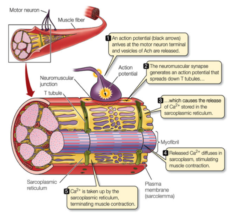 Contraction is stimulated when the muscle fiber innervating α motor neuron releases the neurotransmitter acetylcholine as a consequence of an action potential (electrical signal originating in the neuron). Thus, the action potential is transmitted along the muscle fiber, causing the following effects: