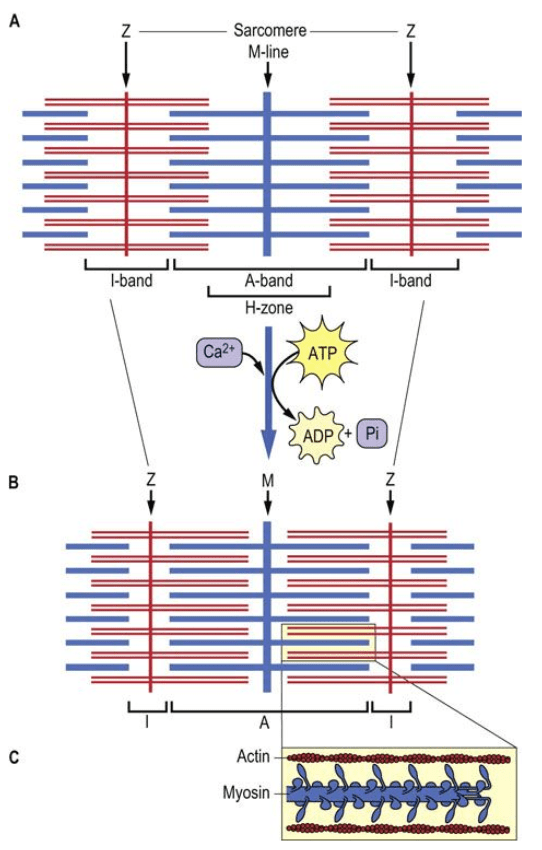 At rest, the thin and thick filaments of a sarcomere slightly overlap. During contraction, the thin and thick filaments slide past each other bringing the Z lines closer to the center of the sarcomere.