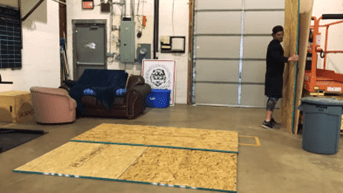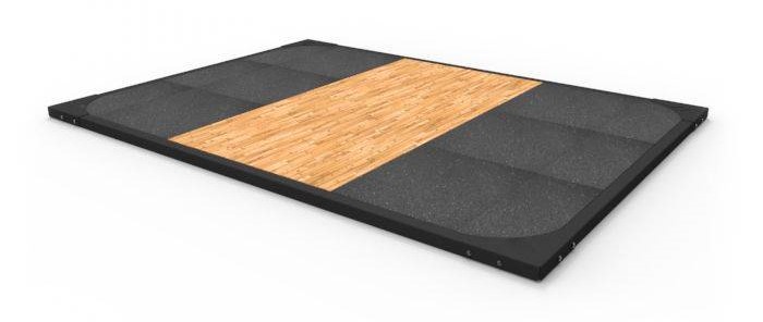 Voilà! Aquí tienes una plataforma de halterofilia que ahorra suelo y reduce el ruido en menos de una hora. La madera de arce en el medio te proporciona algo sólido sobre lo que situarte de pie, mientras que las alfombrillas a los lados te aportan una amortiguación para los pesos de tu barra.