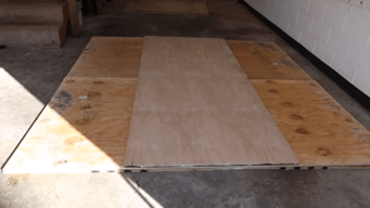 Decide dónde quieres que esté tu plataforma porque una vez que esté ahí es difícil moverla sin desanclar tu soporte para sentadillas. Coloca dos piezas de aglomerado una al lado de la otra. Asegúrate de que no haya un espacio entre ellos.