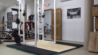 Nota: Una plataforma de halterofilia te elevará del suelo cinco centímetros. Asegúrate de tener suficiente espacio encima para acomodar esto. Lo último que desearías es colocar una plataforma y darte cuenta de que no tienes suficiente altura en tu garaje cuando tus discos atraviesan el techo en un levantamiento por encima de la cabeza.