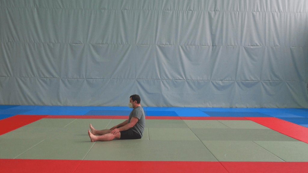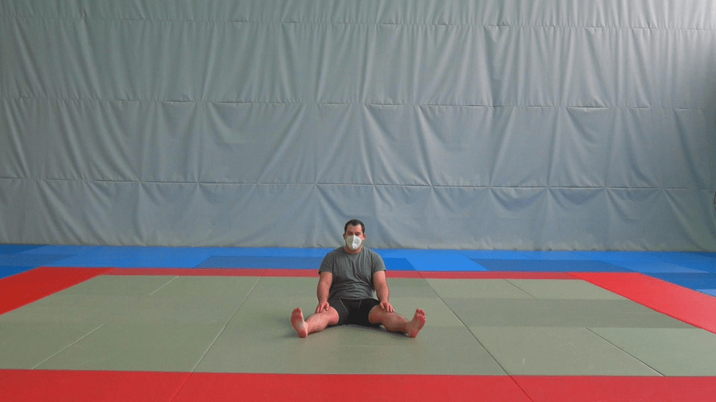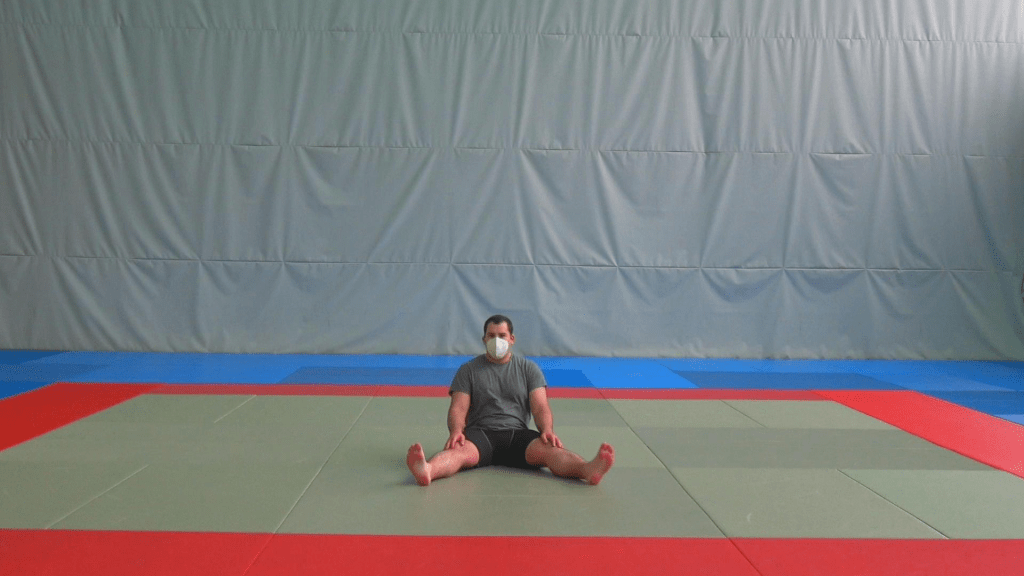 - Starting position: From a sitting position, with your legs extended and open, and your hands in contact with your thighs at knee level.
