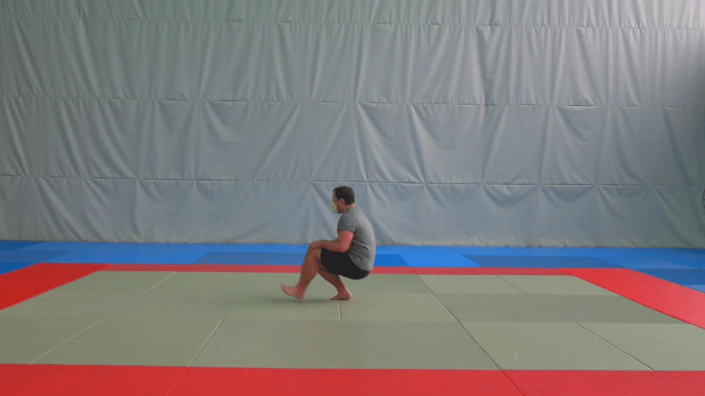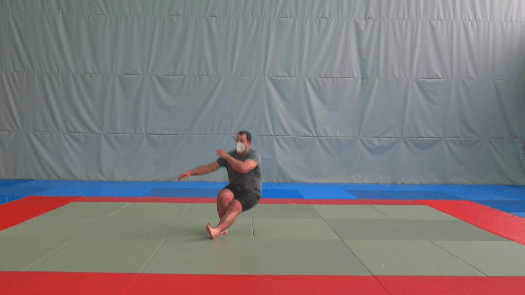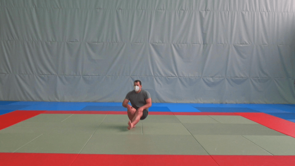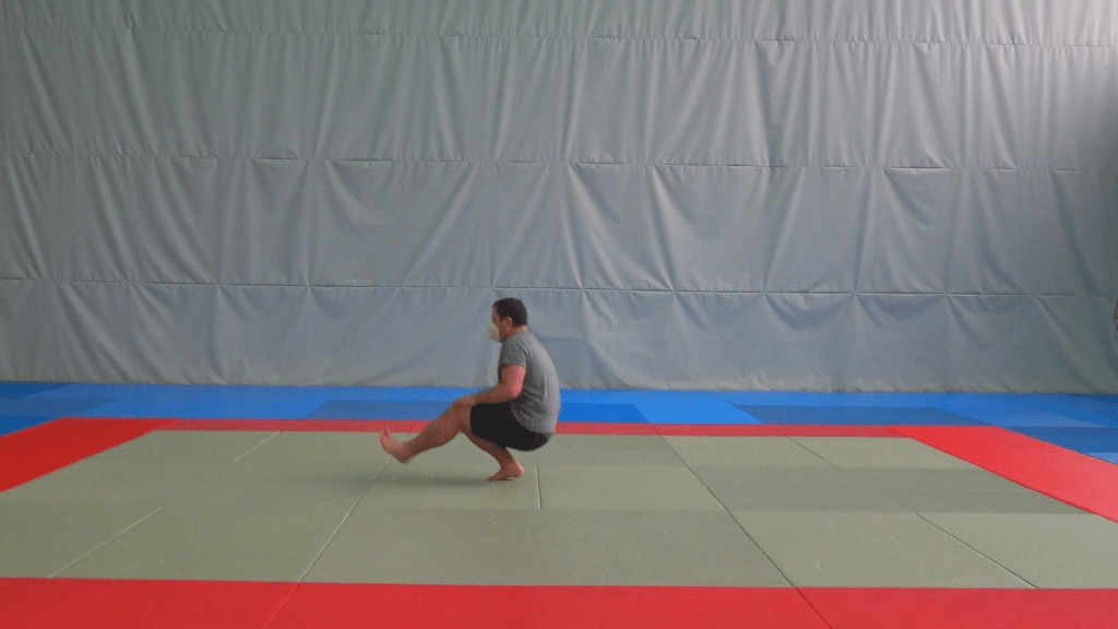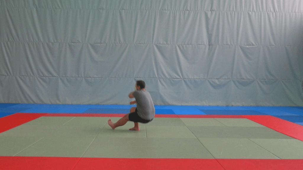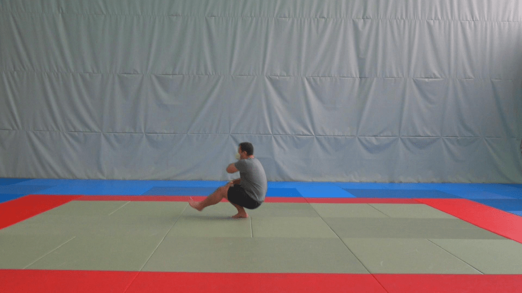 - Execution: We crouch down into a squatting position and roll backwards and to the left with our chin touching the ground. To do this, we keep our left leg extended as we descend and move it towards our right foot so that we can direct our body in that direction. Our hands are in contact with our thighs and remain in contact with them throughout the movement.