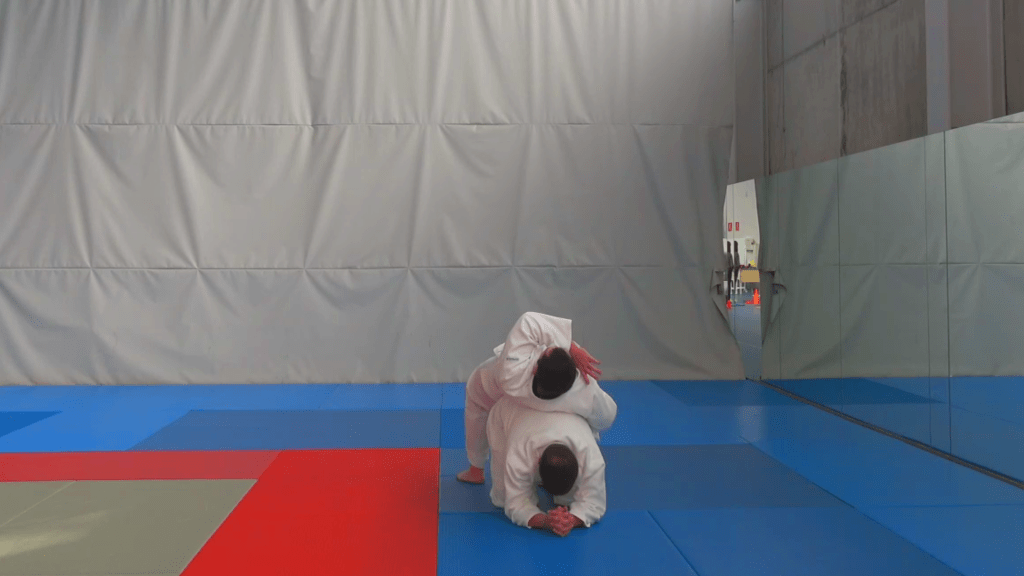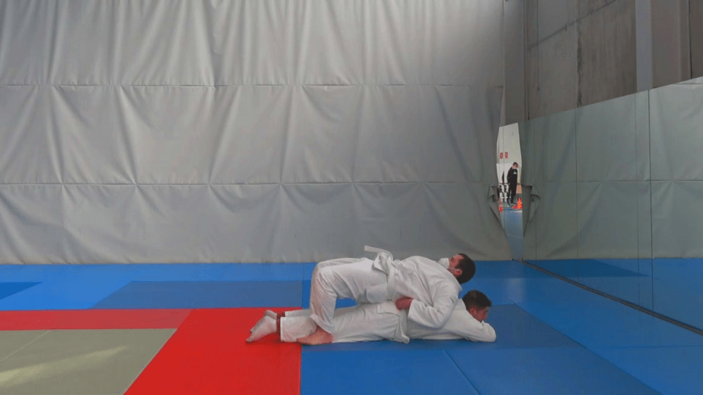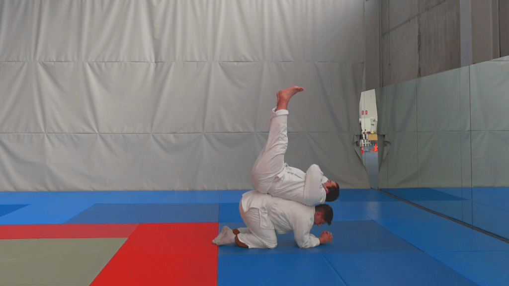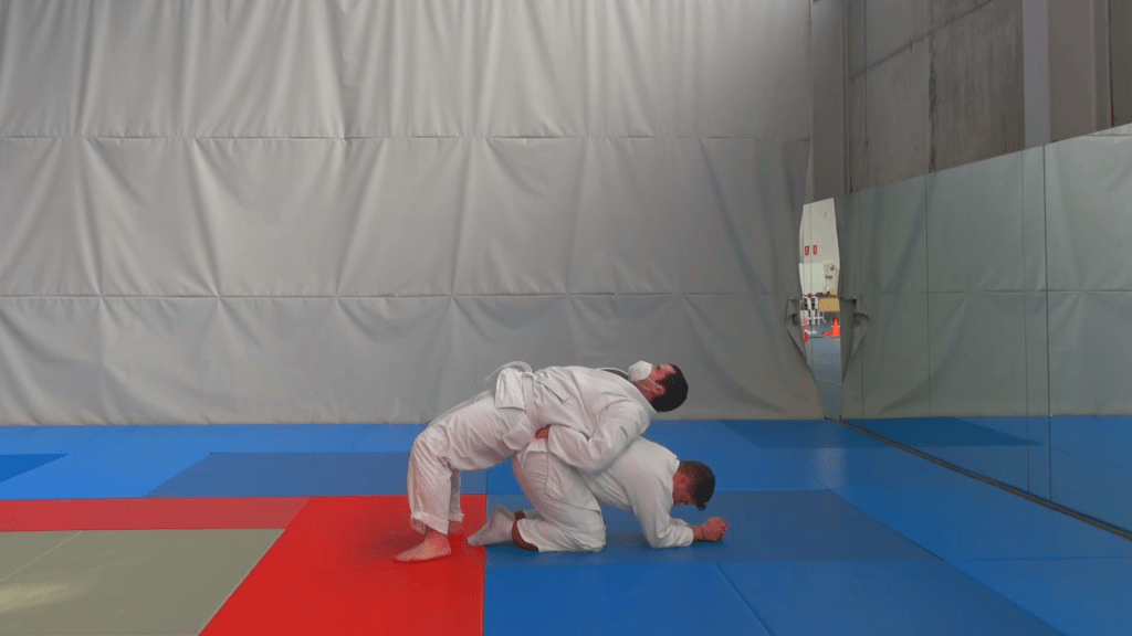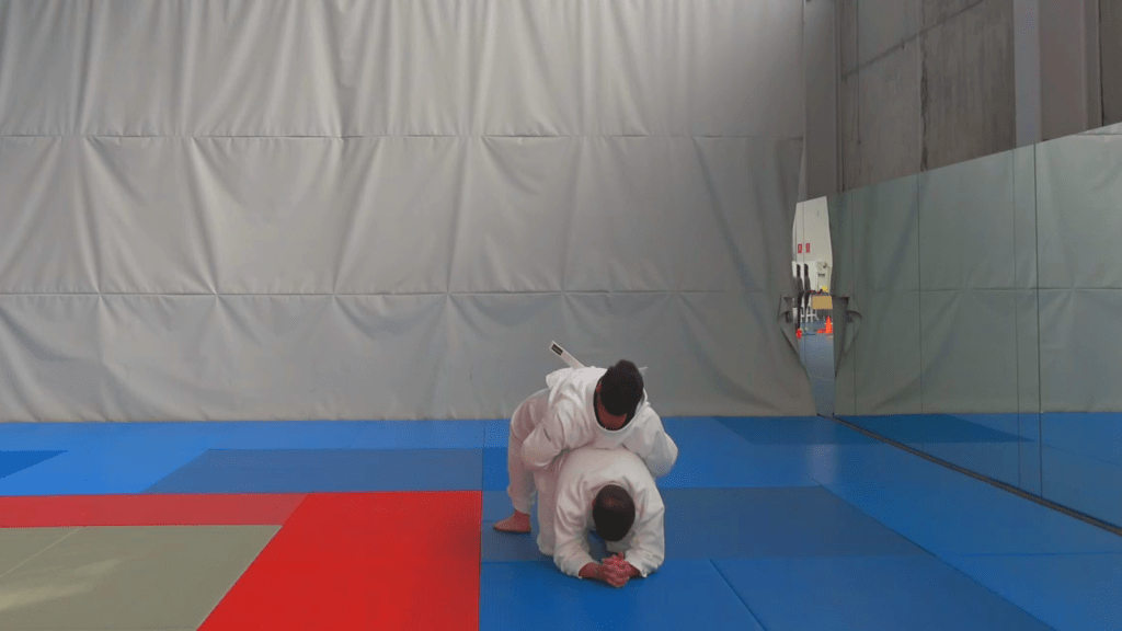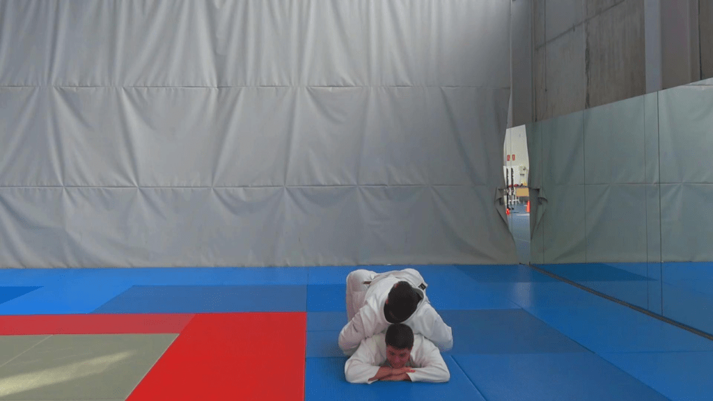 - Starting position: With the help of a partner in a four-legged position on the ground and grouped together as if protecting himself, we place ourselves on top of him in a supine position, raising both lower limbs with our knees extended, and we grab his belt from behind.