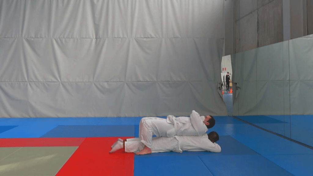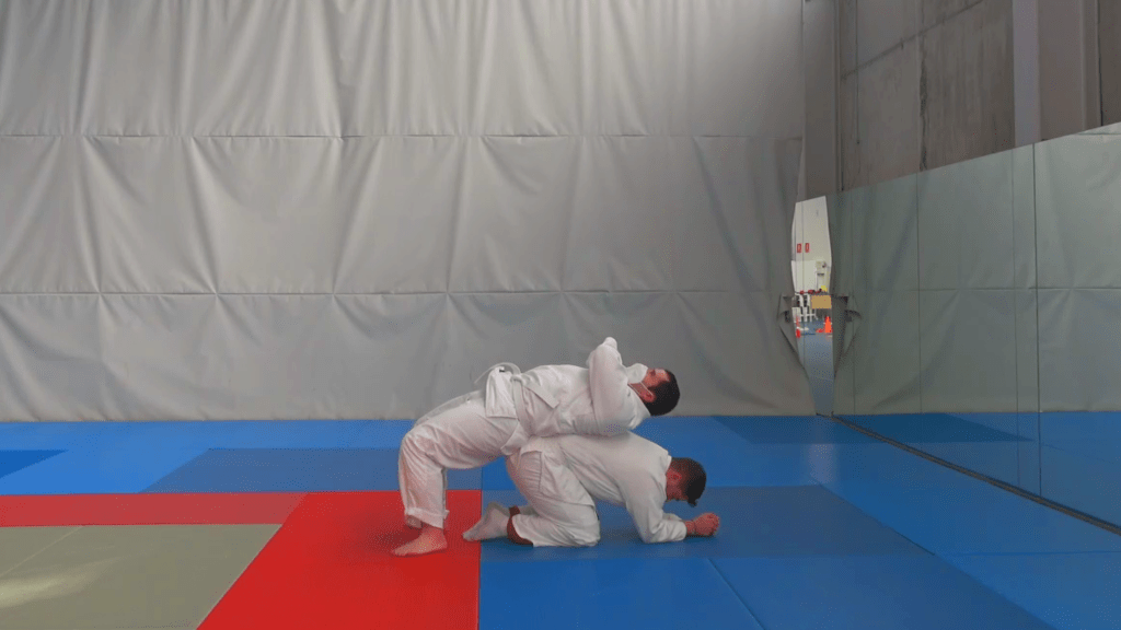 - Starting position: With the help of a partner who is in a four-legged position on the ground and grouped together as if he were protecting himself, we place ourselves on top of him in a supine position with our feet flat on the ground and grab his belt from behind.