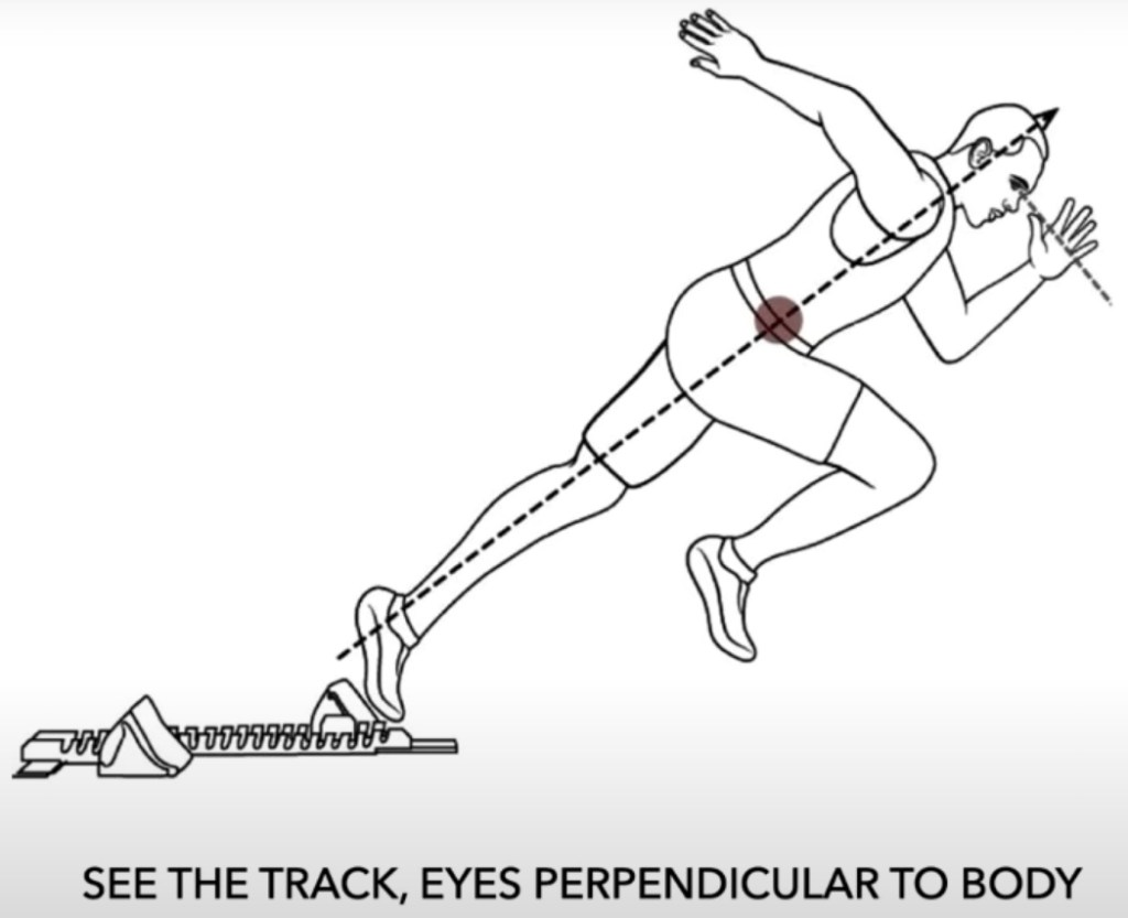 - Accelerate. We start with all of our weight on our front foot. Eyes are down. Split our hands and then rip through all the while we´re going to push the ground behind us. See the track. Eyes perpendicular to the body. When we split and rip coming out, we really want to come out and finish through the hips. When you finish through the hips, you have very good straight lines and you´re not all bent up anymore. We want to fully extend coming out. We won´t come out about 45 degrees with our eyes not up but down. We get to top speed.