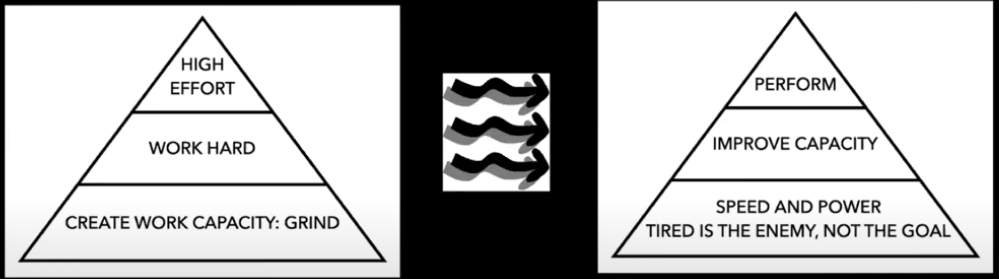 A la izquierda tenemos la pirámide tradicional. A la derecha está el enfoque de “Feed the Cats”. Por eso, los velocistas de Tony Holler nunca superan los 5 segundos, porque quieren entregarse por completo al crecimiento de la velocidad y la potencia, que lleva una eternidad. La velocidad crece como un árbol. La velocidad crece lentamente. Por eso, hay que plantar ese árbol pronto y regarlo a diario, ya que la adaptación se vuelve muy lenta.