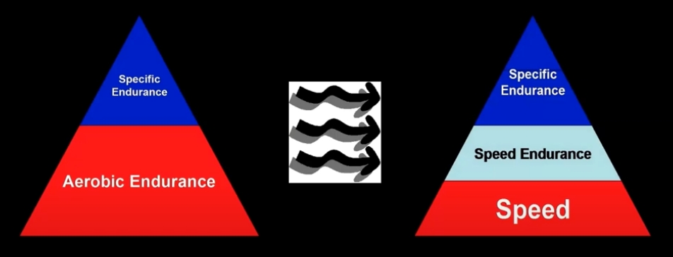 ¿Deberías desarrollar primero la velocidad o la resistencia? Ciertamente no desarrolles primero la resistencia aeróbica, ya que la carrera lenta y prolongada provocará pérdida de velocidad. Protegerás la velocidad incluso en las primeras fases del entrenamiento básico. Algunos entrenadores de velocidad recomiendan un modelo de pirámide invertida: primero se desarrolla la velocidad y luego se añade entrenamiento de resistencia para extender la velocidad a distancias cada vez mayores. Según principios científicos, puedes y debes desarrollar velocidad y resistencia simultáneamente.